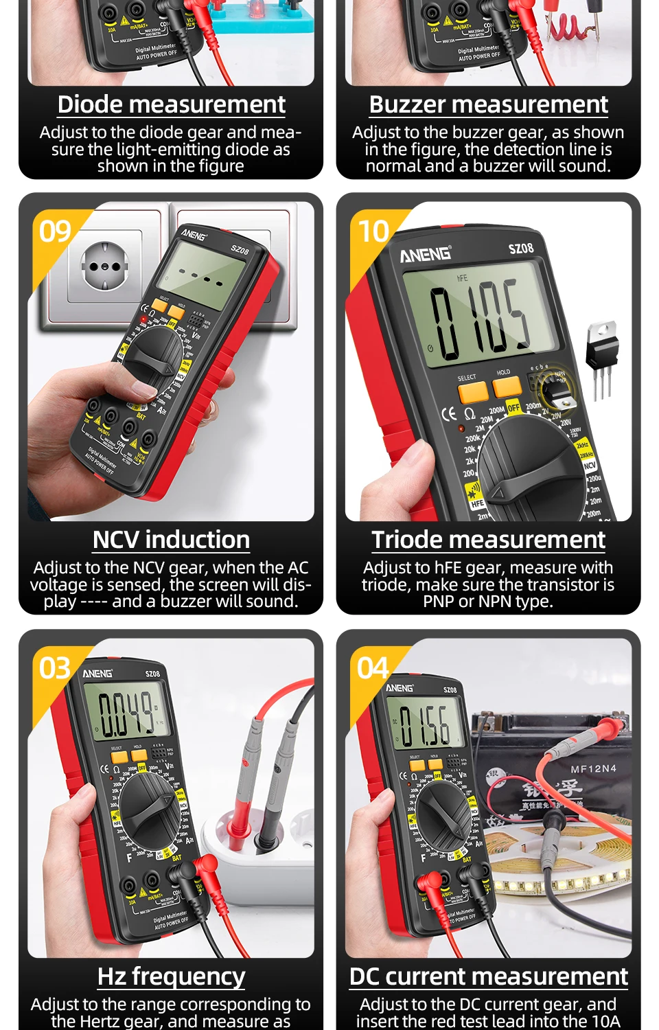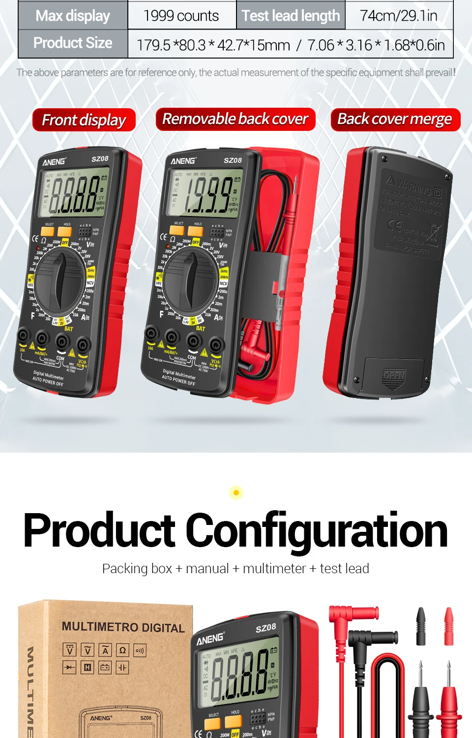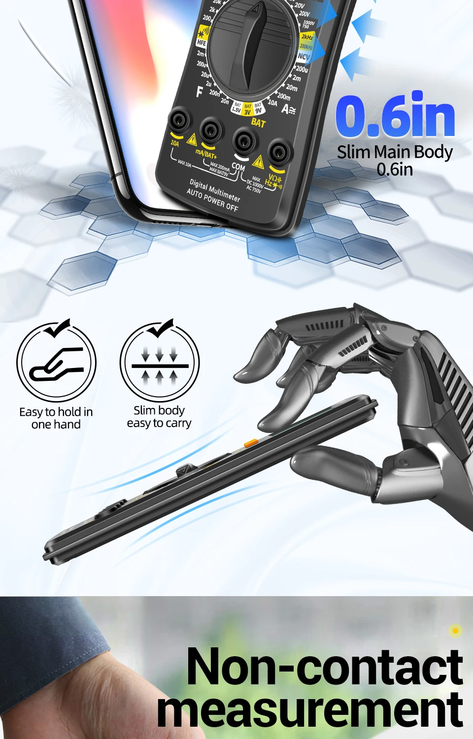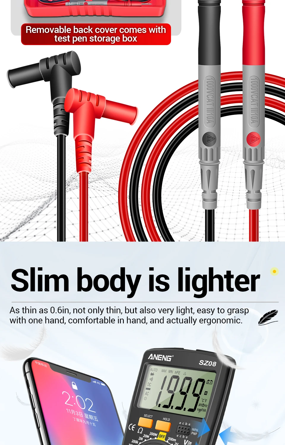 • Ultra-thin Design :The ANENG SZ08 Multimeter boasts an ultra-thin design, making it easy to carry and handle. Its compact size makes it perfect for professionals on the go.
