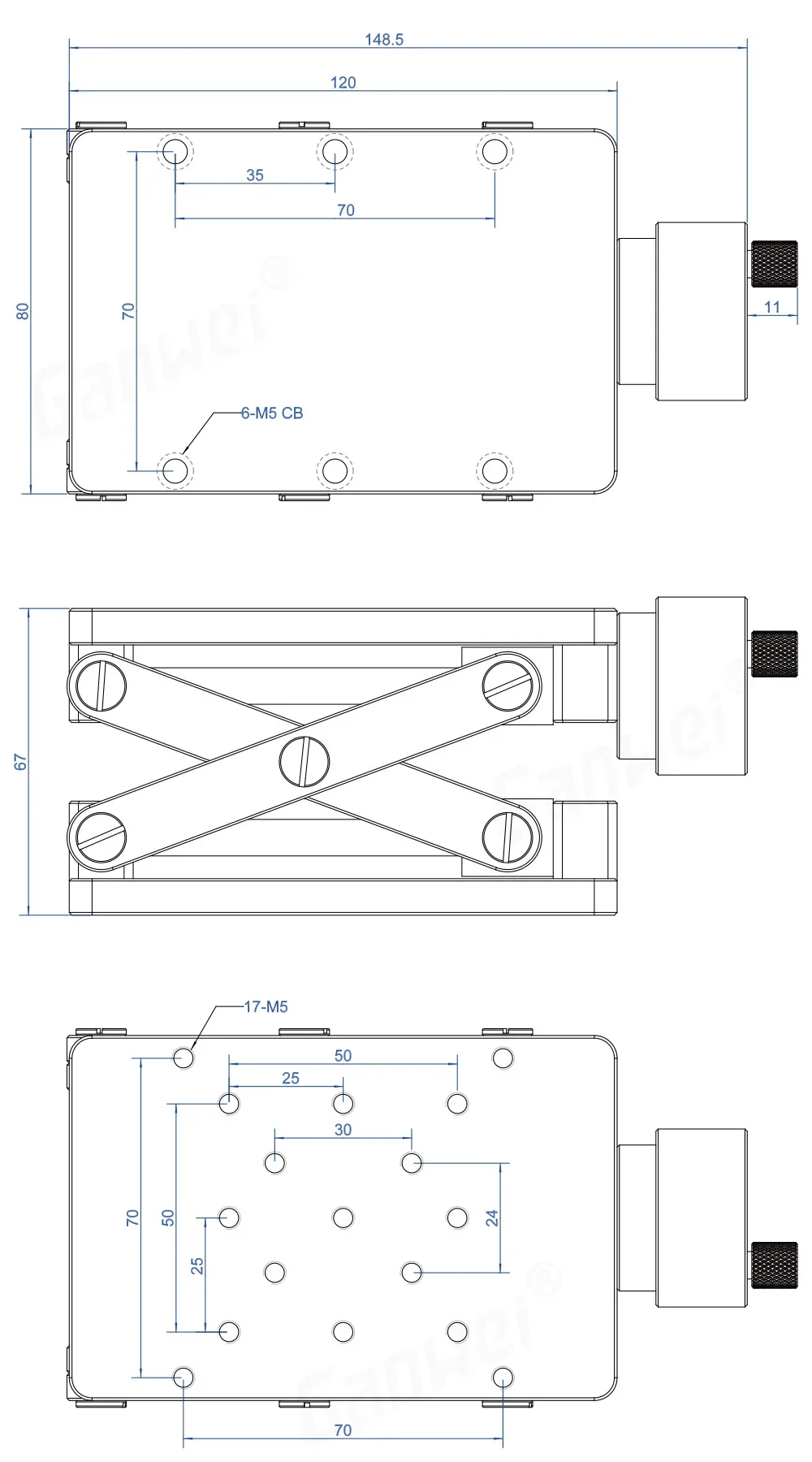 The base height is 67mm,and the maximum lift height is 122mm.M5 connection holes on the top surface, and M5 countersunk fixing holes on the back.