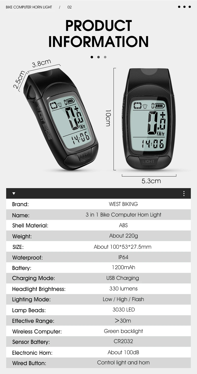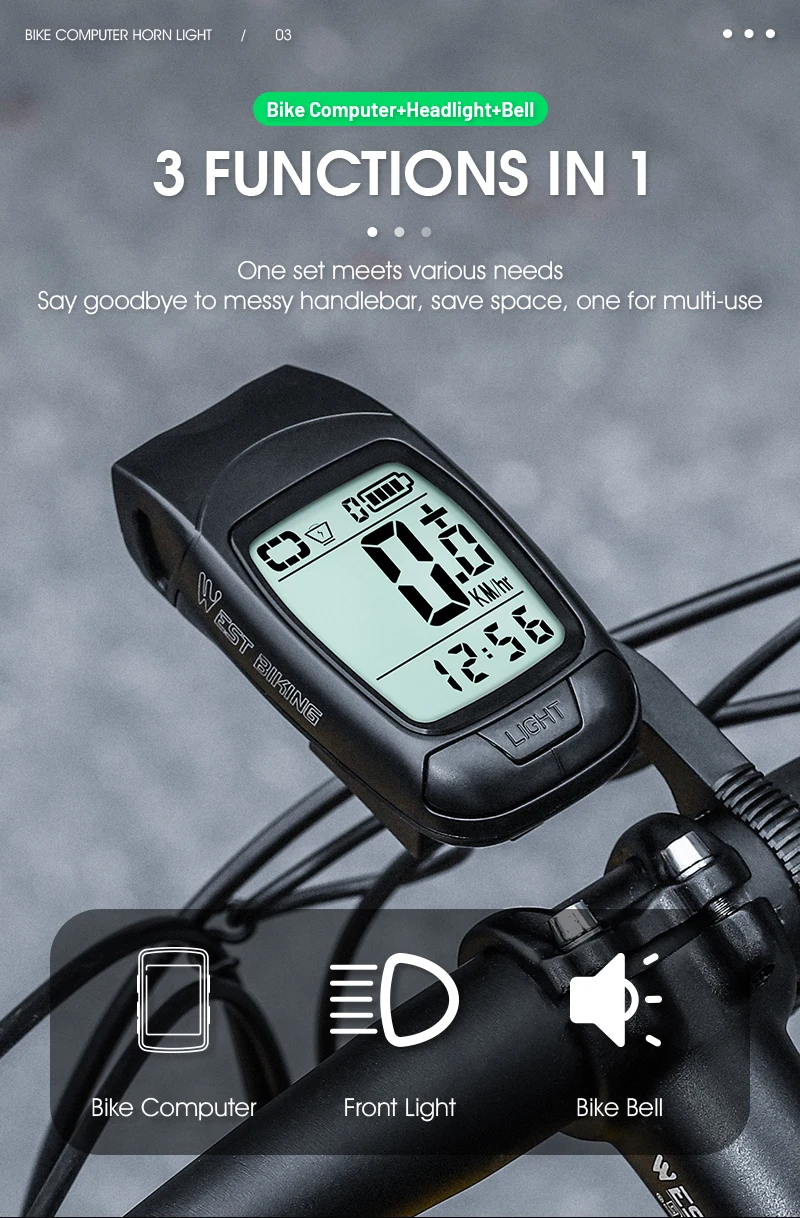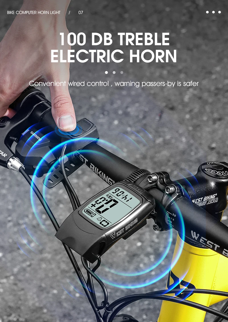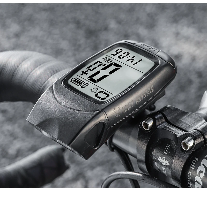 WEST BIKING 3 in 1 Wireless Bike Computer With Horn USB Rechargeable LED Flashlight Waterproof Bicycle Light Cycling Speedometer