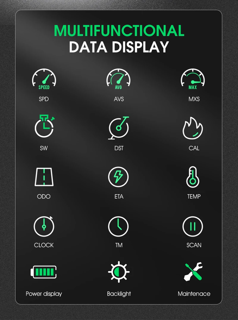Speedometer Function: SPD,ODO,DST,MXS,AVS,TM,TEMP,SW,CAL,ETA,Maintenance,etc.